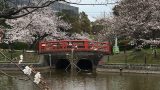 お堀にかかっている赤い橋と桜の調和が美しい。後ろに見えるのは乙川である。